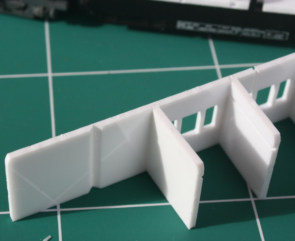 Avec le montage à blanc des éléments tout s’emboite très bien. Les puristes trouveront les cloisons de 1,9mm trop épaisses.Cette épaisseur qui n’est visible qu’au niveau des ouvertures pour les fenêtres des compartiments pourra facilement être réduite par fraisage avec la CNC. Les ouvertures de la cloison longitudinale ne sont pas encore aux bonnes dimensions, le plan d’usinage doit encore être modifié. J’étudierai un peu plus tard une version alternative en bristol, ce qui permet d’éviter la mise en peinture des aménagements.