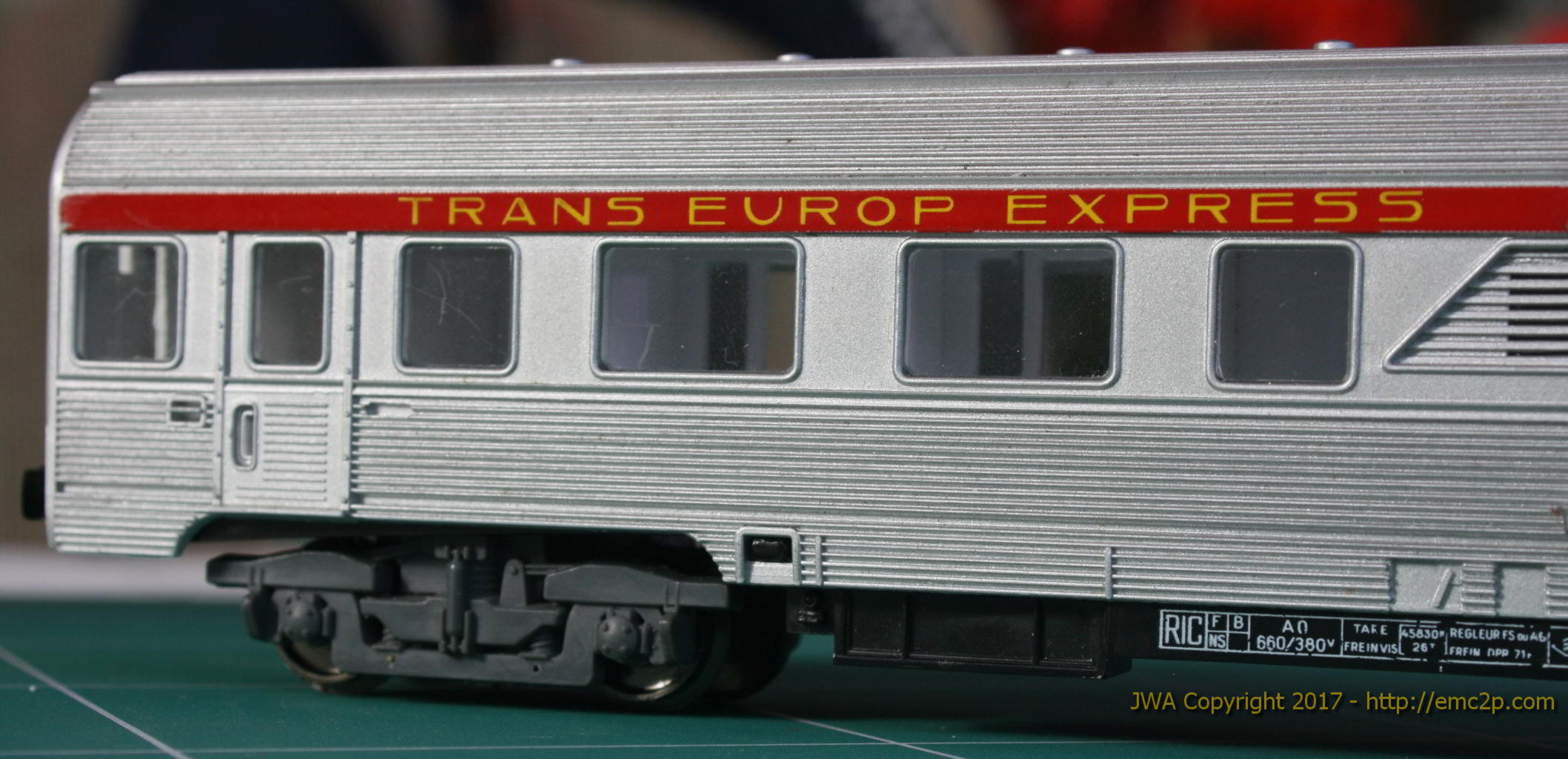 En aucune façon il ne sera question de tout refaire pour obtenir la réplique exacte de la réalité ou pour rivaliser avec les productions actuelles. Ceci n’a aucun sens puisque l’observation se fera à l’oeil nu en situation dans une rame homogène de voitures Jouef en mouvement sur un réseau. Je ne fais pas partie des jusqu’au-boutistes qui cherchent à reproduire les détails invisibles à l’oeil nu.
