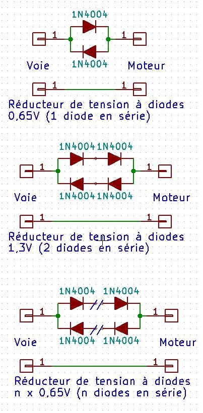 Les diodes peuvent être du type 1N4004 pour des courants jusqu’à 1 ampère, ce qui est généralement suffisant pour les moteurs des locomotives à l’échelle HO.