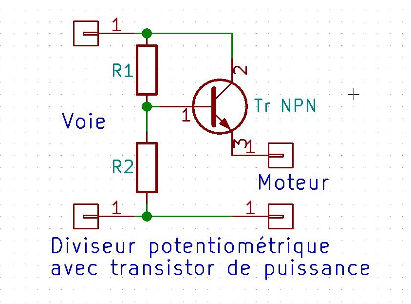 Diviseur de tension de puissanceDans ce schéma, le transistor “se débrouille” en faisant ce pour quoi il est conçu pour maintenir la tension du moteur égale à la tension fournie par le diviseur potentiométrique. Les électroniciens feront les calculs et préciseront que la tension de seuil de la jonction Base / Emetteur et que la valeur du courant de base Ib introduisent une différence entre la tension appliquée au moteur et la tension fournie par le diviseur de tension. Cette erreur reste faible et ne pose aucun problème pour cette application.
