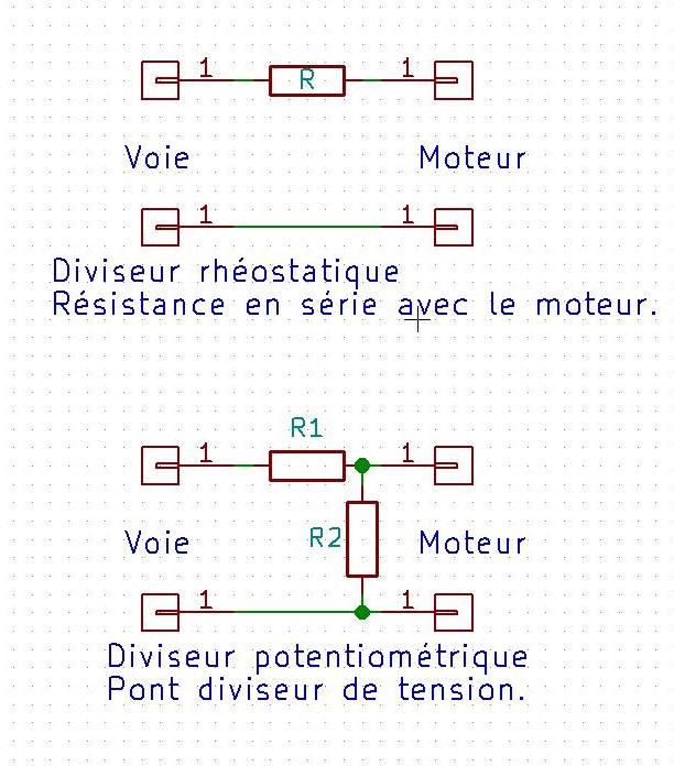 Diviseur potentiométriqueLe diviseur potentiométrique permet de définir le rapport de division de la tension par la formule Vmot = Vvoie (R2 / (R1 + R2))